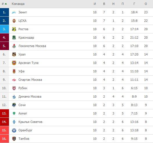 Турнирная таблица после 10-и туров выглядит следующим образом: