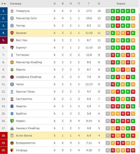 Турнирная таблица по итогам 6 туров выглядит следующим образом: