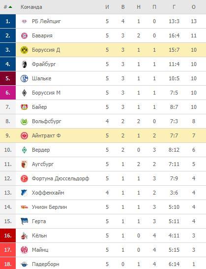 Лидерство чемпионата удерживает «РБ Лейпциг», который в 5-м туре разгромил «Вердер». Несмотря на достаточно активную игру хозяев, довести свои моменты до ума они так и не смогли.