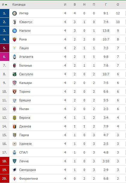 Кто бы мог подумать, что именно «Интер» будет единоличным лидером Серии А по результатам четырёх туров. Именно так и произошло. Победа над «Миланом» благодаря голам Брозовича и Лукаку во втором тайме позволила «чёрно-синим» набрать 12 очков и удержать лидерство.