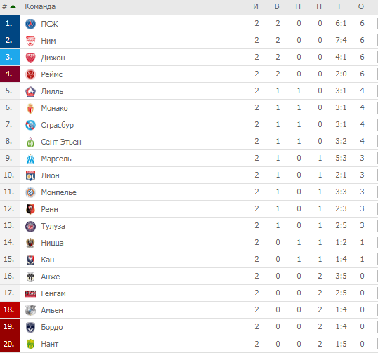 На данный момент во французской Лиге 1 сразу 4 команды имеют 6 очков после двух туров. Это ПСЖ, «Ним», «Дижон» и «Реймс». Все остальные коллективы уже потеряли очки.