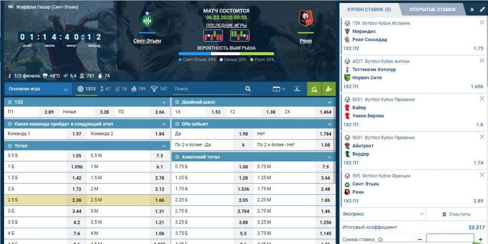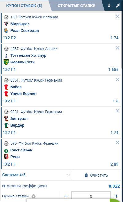 Для демонстрации возьмём матчи кубков Англии, Германии, Испании и Франции по футболу в букмекерской конторе «1X Stavka».