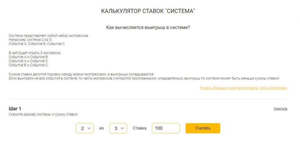 Так, к примеру, выглядит онлайн-калькулятор для расчета букмекерских систем, который предоставляет БК «Пари Матч».