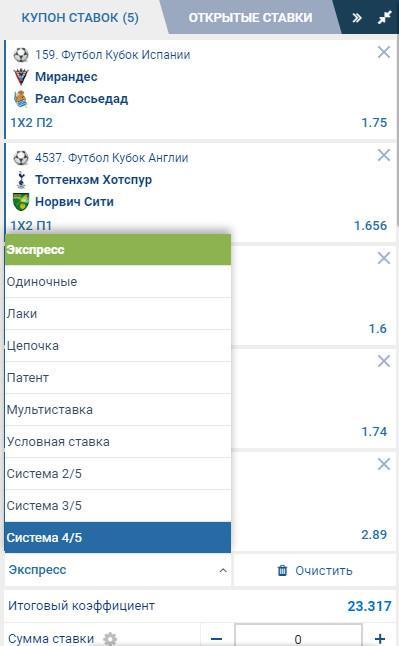 Видим экспресс из 5 поединков, на которые 1х Ставка предлагает привлекательный коэффициент 23,317. Для подстраховки поменяем тип ставки в правой нижней части экрана и вводим подходящую размерность, как оговаривалось выше: 4 из 5. Как мы видим, компания предлагает большое количество разных типов сделок, среди которых также значатся цепочка, патент, мультиставка, условная ставка, ординары и т.д.