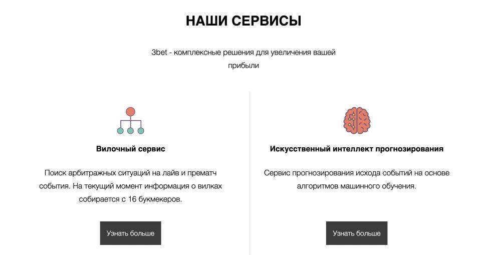 Ещё один недавно появившийся сервис, который сканирует 16 популярных букмекерских контор в прематч и live режимах. Заявленное время ожидания составляет 3 секунд, но выбор ставок не велик – победы, тоталы, форы, угловые, да и качество вилок, судя по отзывам, оставляет желать лучшего. Правда, 3 Bet выделяет демократичная цена – всего от 590 до 1490 рублей в месяц.