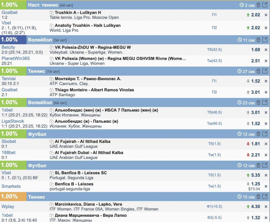 Обычно поиск вилок в букмекерских конторах производится в двух категориях: прематч и live. Идеально, чтобы выбранный сервис искал данные в обоих режимах.