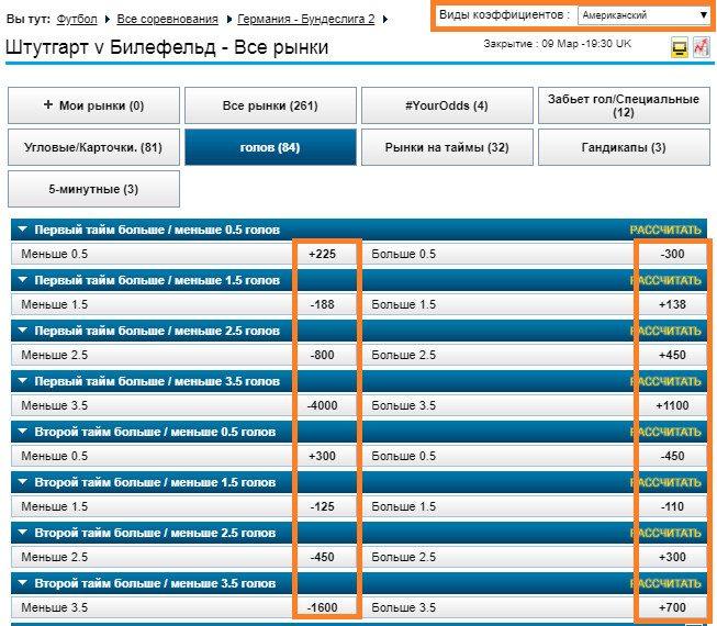 Английский вариант позволяет видеть, насколько выгоден кэф, отражающий доли участников пари. Рассчитать выигрыш в букмекерской конторе можно также, как при европейском варианте — путем умножения на кэф. Например: 10$*8/15=5.33$. Но здесь мы сразу получаем прибыль. Если ставка зайдет, то игроку вернется 15.33$.