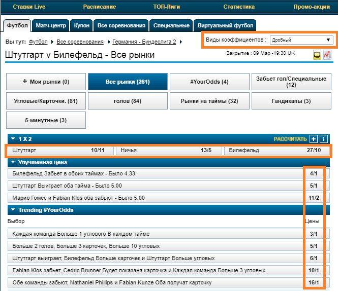 Дробный вариант кэфов выглядит следующим образом: 1/3, 11/1 или 8/15. Дроби отражают соотношение долей, где первая часть принадлежит БК, а вторая — игроку.
