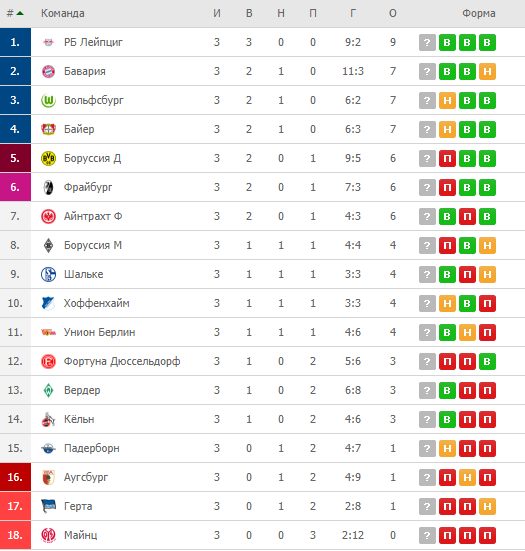 Вся интрига немецкого чемпионата заключается в том, сможет ли кто-то остановить «Баварию«. В матче 3 тура мюнхенцы разгромили «Майнц» (6:1) и теперь идут вторыми, имея 7 очков. «Боруссия» Дортмунд потерпела первое поражение, уступив «Унион Берлин» (1:3). Лидирует «РБ Лейпциг«, в третьем туре победивший «Боруссию» М (3:1). Единственной командой, не набравшей очков, остаётся «Майнц».