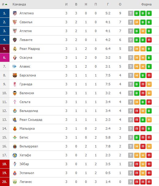 Испанский чемпионат начался довольно необычно. Ни «Реала», ни «Барселоны» нет в четвёрке сильнейших после 3 туров. Лидирует «Атлетико», который после 0:2 смог забить 3 мяча и вырвать победу у «Эйбара».