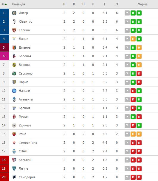 «Ювентус» делит первую строчку с «Интером» и «Торино«, которые также имеют по 6 очков. «Рома» плетётся далеко внизу, имея всего 2 очка.
