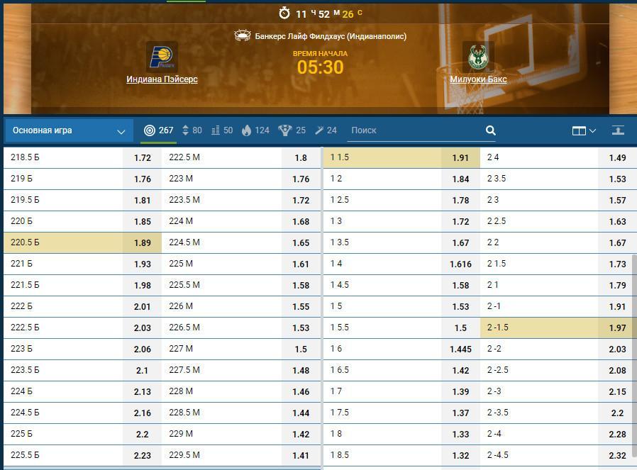 Мы ищем поединки клубов примерно одного уровня, где вероятны «качели» (преимущество переходит от одной команде к другой). В качестве образца рассмотрим матч НБА между «Индиана Пэйсерс» и «Милуоки Бакс». Судя по котировкам, «Бакс» считается неявным фаворитом поединка. Компания «1Х Ставка» предлагает их чистую победу за 1,885. Мы же попробуем взять одновременно Ф1 (+4,5) за 1,58 и Ф2 (-1,5) за 1,97.