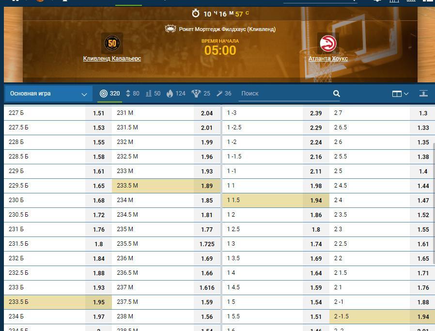 Аналогично выбирается коридор в баскетболе на тотал набранных очков. Для примера рассмотрим игру регулярного сезона НБА «Кливленд Кавальерс» – «Атланта Хоукс». Так букмекер «1Х Ставка» предлагает нам следующие интересные варианты: