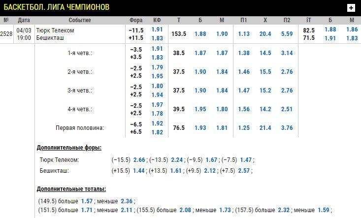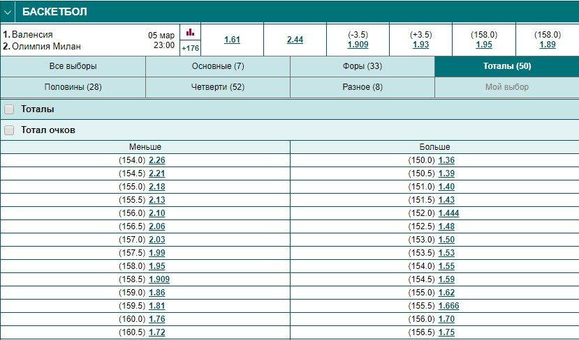 Баскетбольный матч Евролиги Валенсия — Олимпия Милан имеет потенциально интересный коридор: ТБ 155 с К 1.62 и ТМ 160 с К 1.72. Хотя это не оптимальные коэффициенты, они позволяют создать ловушку для тотала. Если баскетболисты забьют от 156 до 160 мячей — сыграют обе ставки. Количество голов выйдет за указанные рамки — зайдёт только одна из них, позволив снизить потери.
