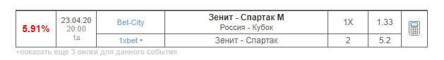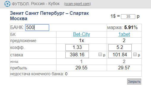 У «Betcity» ставим на проход «Зенита» или ничью в основное время за 1,33, а затем переходим на «1X Bet», где нас интересует триумф «Спартака» за 5,2. Скажем, при банке в 500 рублей прибыль будет гарантирована при ставке 398,16 руб на 1Х и 101,84 на П2.