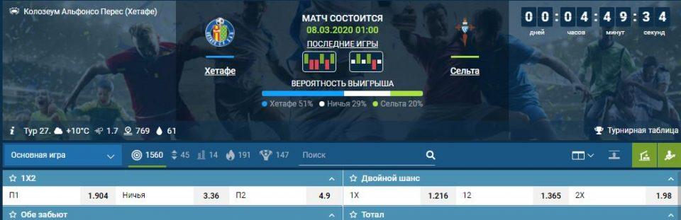 В качестве примера рассмотрим матч испанской примеры «Хетафе» – «Сельта». На исход П1 «1X Stavka» предлагает привлекательные 1,904.