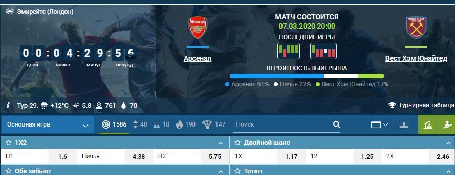 Для примера разберём матч очередного тура английской премьер-лиги «Арсенал» – «Вест Хэм». 1х Ставка предлагает ничейный исход за 4,38.