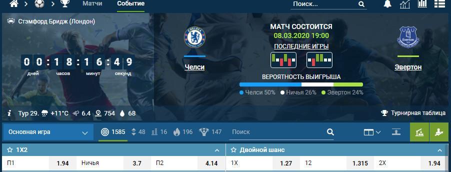 Теперь рассмотрим применимость этой формулы на практике. Для примера возьмём матч очередного тура АПЛ «Челси» – «Эвертон». Компания «1X Ставка» предлагает победу хозяев за 1,94, то есть оценивает их триумф в 51,55%. Это будет вероятность P (A).