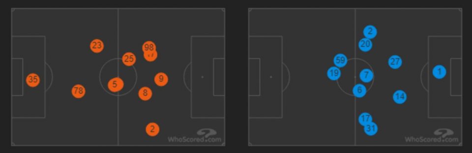 Гончаренко вернулся к схеме с тремя центральными защитниками. Местами могли наблюдать два. Его подопечные чаще смещались в центр поля, Обляков больше помогал Сигурдссону.