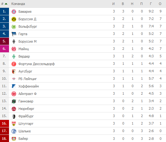 По 7 очков в своем активе также имеют «Вольфсбург», «Герта», «Боруссия» М и «Майнц».