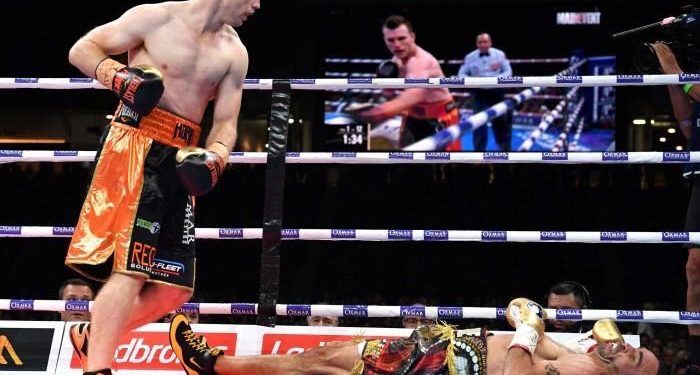 Очередная комбинация Хорна (правый крюк по корпусу и сдвоенный левый боковой, один из которых пришелся точно в подбородок) поставила точку в этом поединке. Мандин оказался в тяжелом нокауте и не смог подняться с канваса.