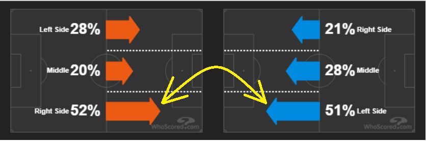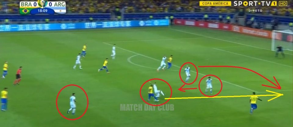 Большинство атак бразильцев проходили по правому флангу — 52%. Аргентина чаще шла вперед левым флангом — 51%.