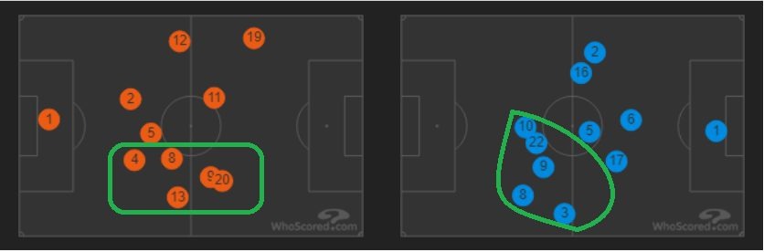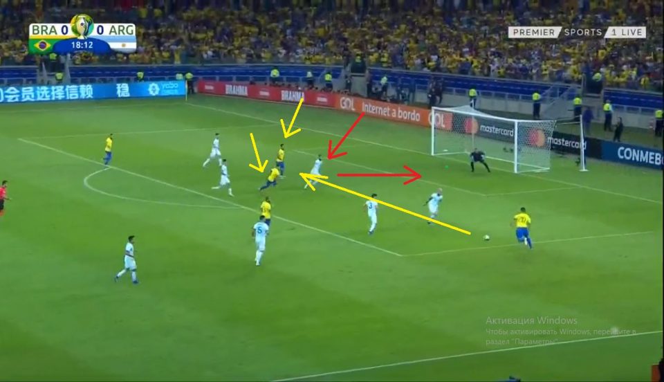 Фирмино (№20) можно было записывать как правым нападающим. «Ярко-желтые» делали перегруз в сторону Акуньи, Тальяфико и Отаменди, где аргентинским игрокам приходилось смещаться для подстраховки на левый фланг, в случае ошибки партнеров.
