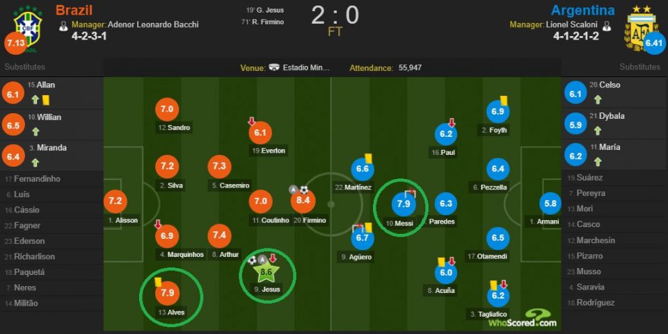 Месси снова «тащит» на себе команду (оценка 7.9), Агуэро «жадничает» с голевыми передачами и берет игру на себя. Класс игроков, командная игра бразильцев и ошибки соперника — залог успеха хозяев.