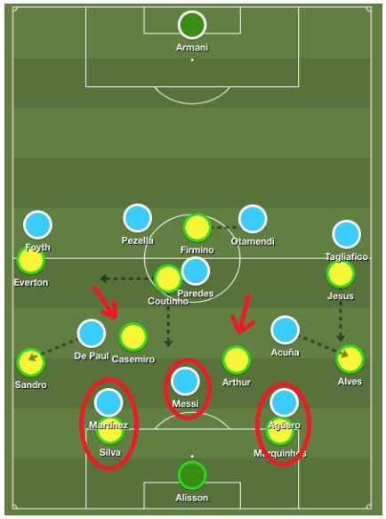 При прессинге «бело-голубых» именно Каземиро чаще оставался свободным в центре поля (Месси не особо помогал в отборе мяча) и его передачи шли на фланги.