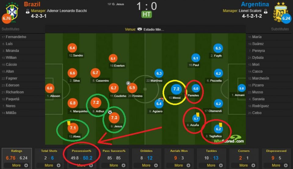 Кроме этого момента, Аргентина ничем другим не запомнилась. Оценки игроков тому подтверждение. Обратите внимание на графу «владение мячом»: 49.8% на 50.2%, когда на 21 минуте было 61% на 39%.