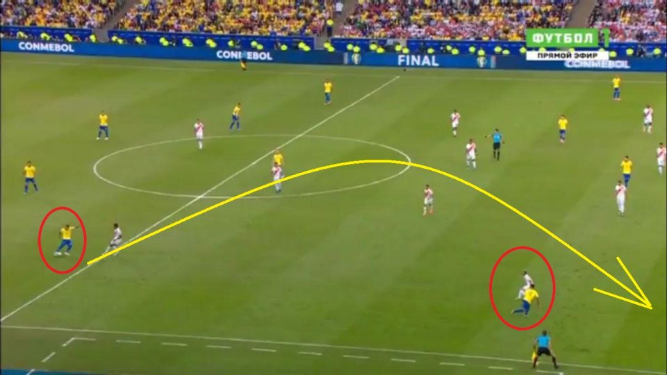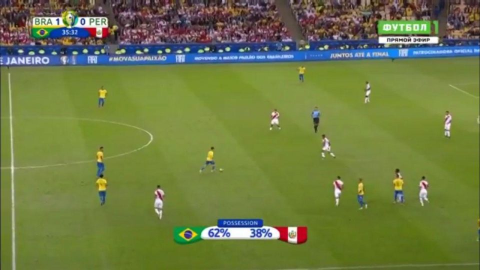 Бразилия продолжала «давить» соперника. 35-я минута. Статистика владения мячом: 62% на 38%. Полное доминирование хозяев. На все, что была способна Перу — подачи со стандартов.