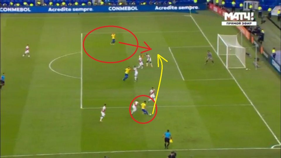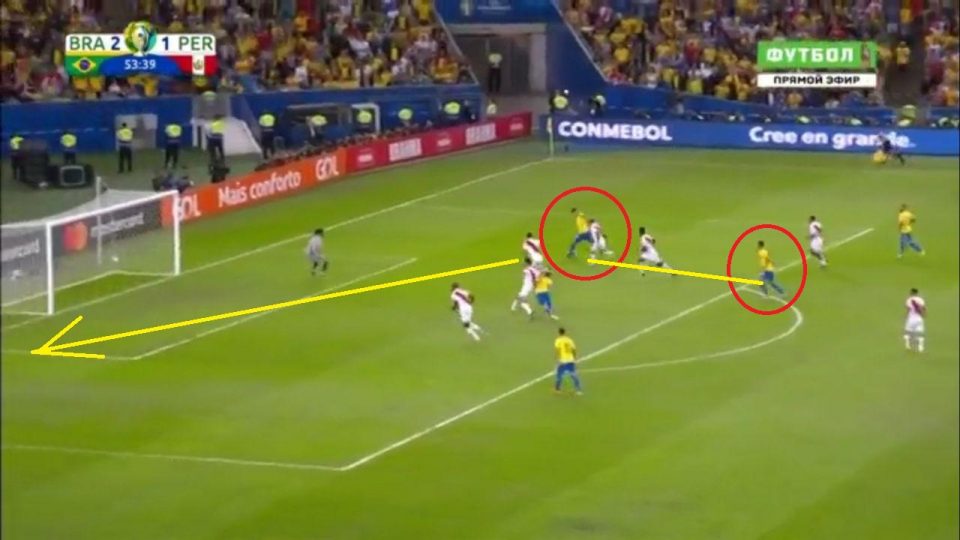 Сперва Фирмино (!) , который потерял мяч, отобрал «круглого» на половине поля соперника. Игрок Перу поскользнулся, а Артур прошел без сопротивления вперед и выкатил мяч на Жезуса. 2:1 (Обратите внимание на то, что 2-й игрок Перу также поскользнулся при передаче Артура.