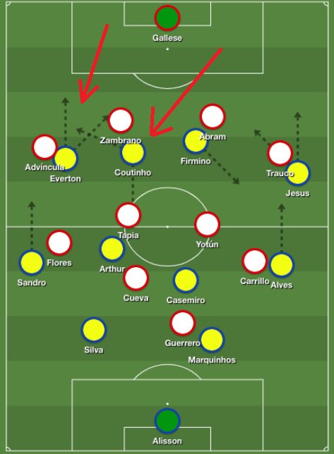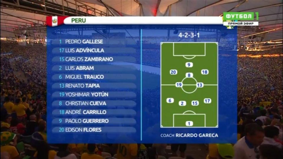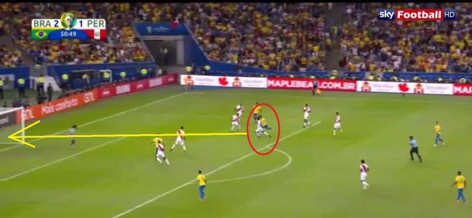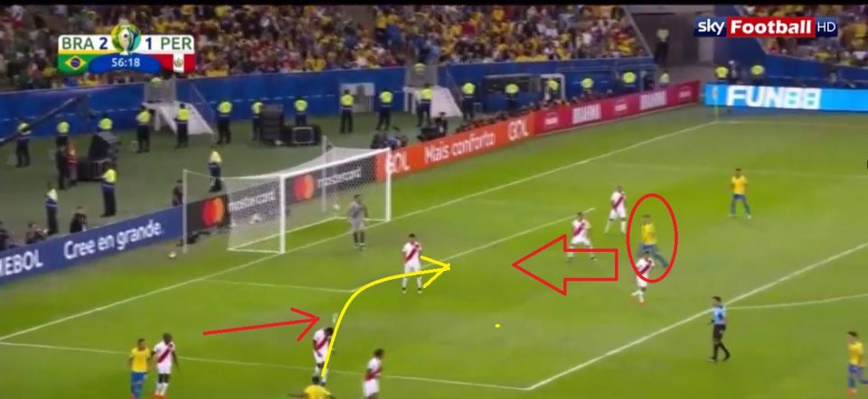 Его сразу же прессингуют три (!) футболиста Перу, но бессмысленно. Он делает подачу на Эвертона, которого никто не опекал. Где был правый защитник Адвинкула?