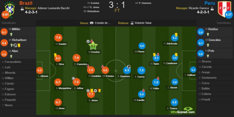 Третий гол хозяев подчеркивает суть поединка — Бразилия наголову сильнее Перу.