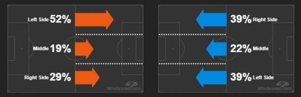 Бразилия — команда, которая любит атаковать флангами. В этом поединке атаки чаще проходили по левому краю — 52%.