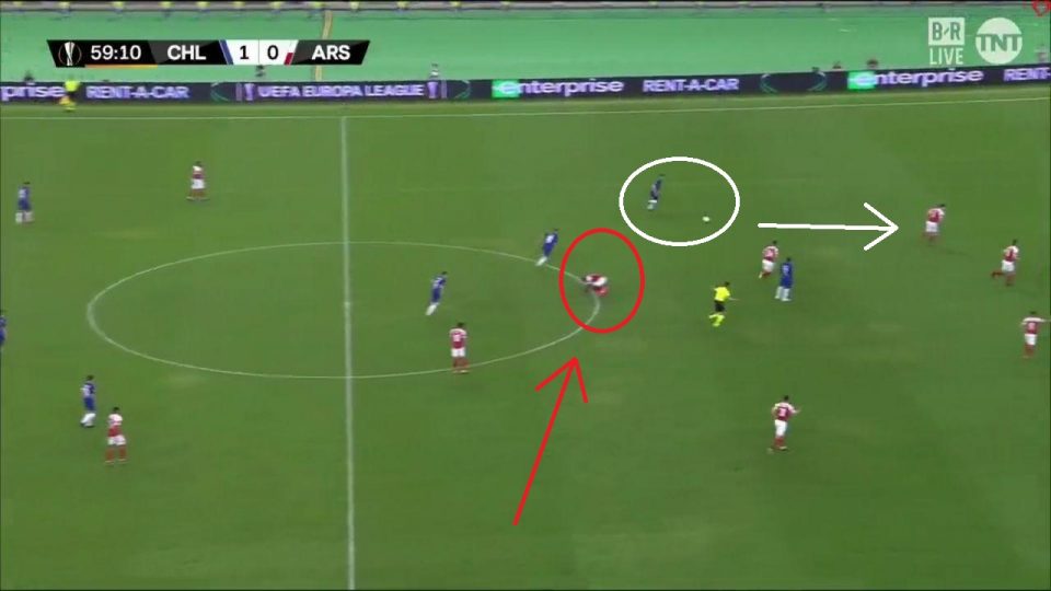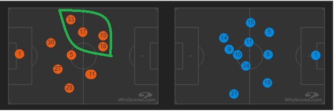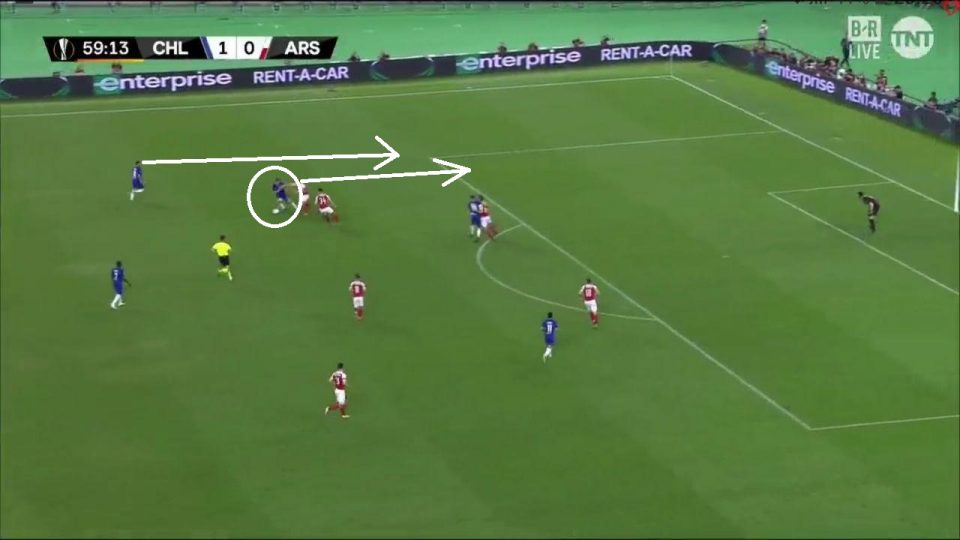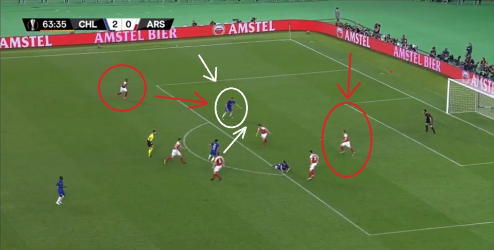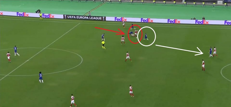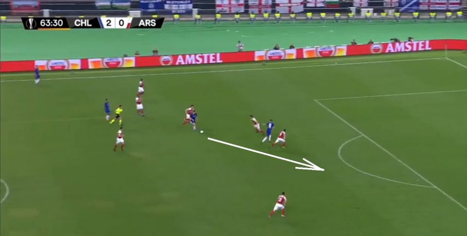 Можно заметить интересный нюанс: при владении мячом, 4-5 игроков «Челси» чаще смещались на левый фланг. Они проводили большую часть своих атак по левому краю, так как именно там у «Арсенала» было «слабое звено» — Мэйтлэнд-Найлс, который и получил одну из худших оценок (5.7!).