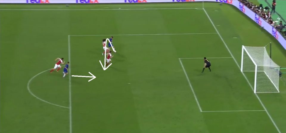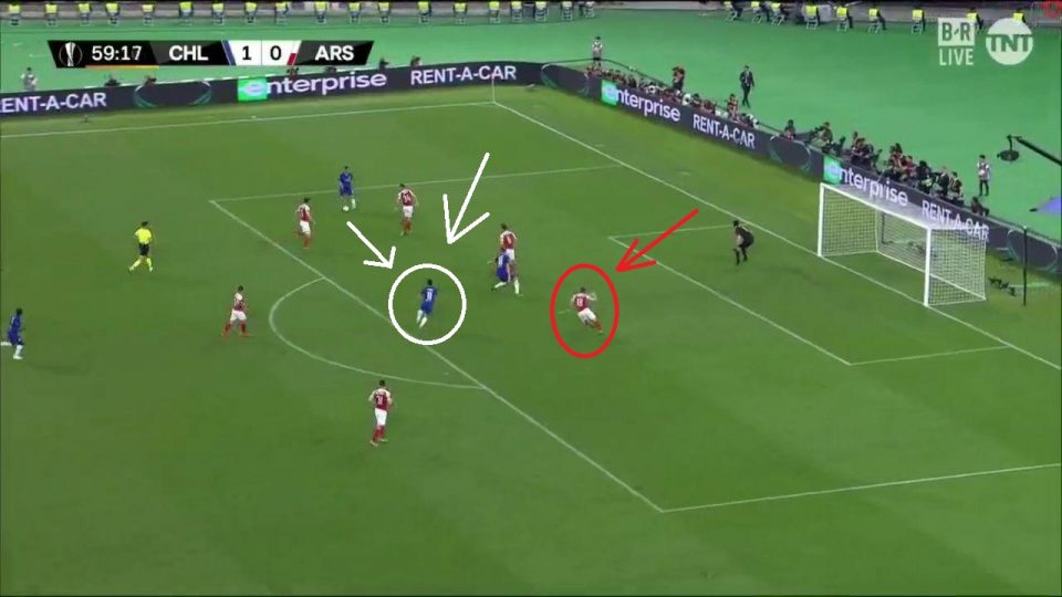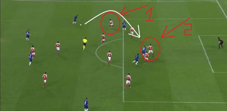 Первый гол. Изображение 1 — Эмерсон принимает мяч и получает 3-4 секунды пространства для подачи. Более того, его никто не накрывает, хотя, по идеи, это должен был делать Мэйтлэнд-Найлс (ошибка 1). Второе, проигранная позиция центрального защитника Колашинаца против Жиру (ошибка 2).