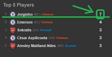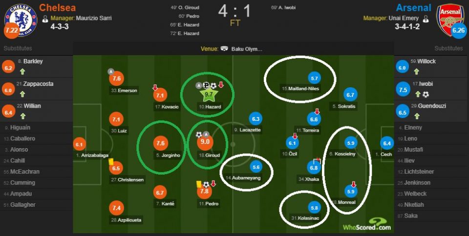 Заострите внимание на оценки игроков «Арсенала» — ср. оценка 6.3! Когда у соперника, лучший игрок — Азар с 9.7!