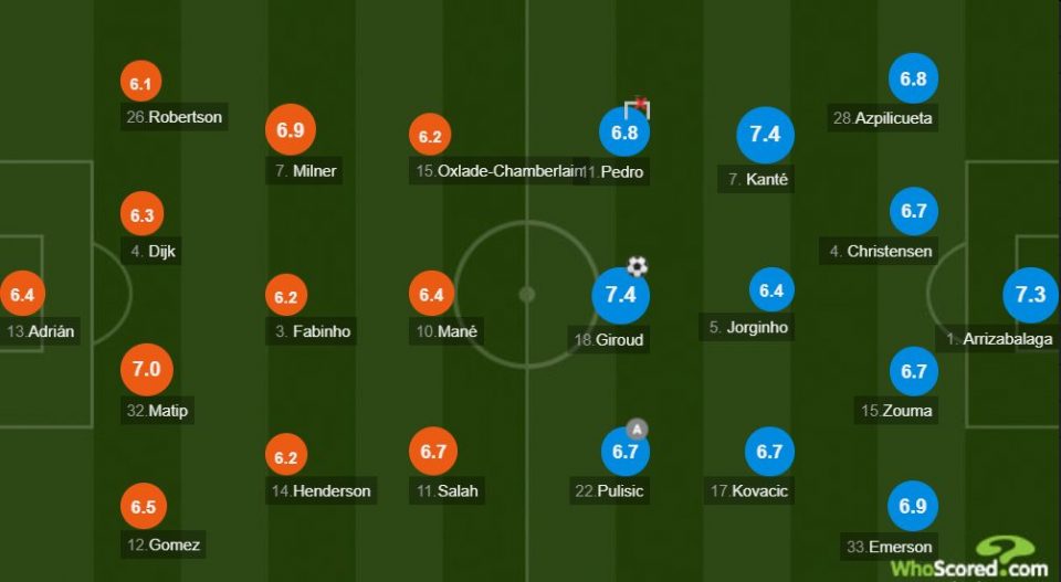 Так как Алиссон был травмирован, вместо него вышел Адриан. Клопп внес коррективы в нападении: вместо Фирмино и Ориги вышли Мане и Чемберлен, в полузащите Милнер заменил Хендерсона, в центре защиты — пара Ван Дейк и Матип.