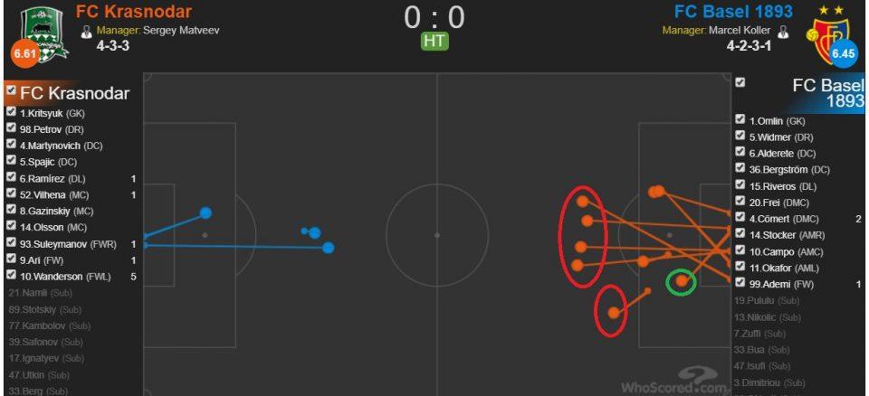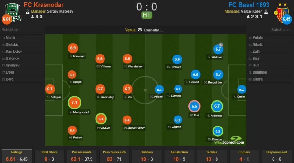 К средине первой половины встречи игра постепенно успокаивалась. Российские игроки не могли полностью завладеть инициативой и создать голевой момент, «Базель» спокойно отбивал атаки оппонента.