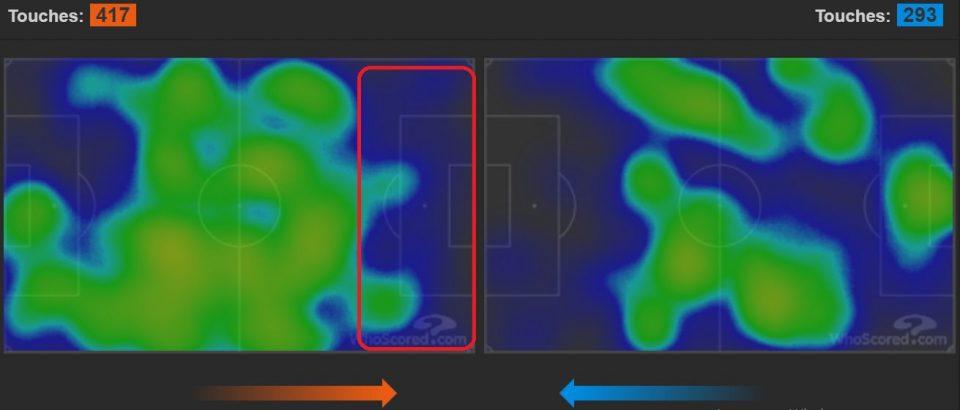 Тепловая карта. Вы сможете увидеть где чаще всего находился мяч у обеих команд. Заметьте, «круглый» очень редко находился в 14 и 15 зонах!
