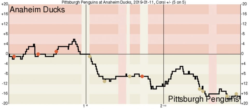 На графике Корси наглядно видно, что первый период прошел с преимуществом «Анахайма».