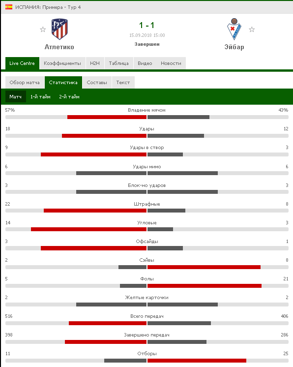 Статистика игры даёт частичное понимание того, что, собственно говоря, происходило на поле в этой встрече. Порой цифры неверно отражают суть матча, противоречат тому, что было в игре. Но в других случаях, они являются прекрасной иллюстрацией событий. Игра «Атлетико» — «Эйбар» относится ко второму случаю.