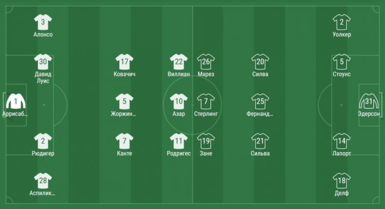 Горожане навалились на ворота «Челси», но найти больное место не могли. И лишь после 30 минуты смогли создать ряд моментов, где самоотверженно действовали защитники хозяев. Лерой Сане вышел на ударную позицию и пробивал мимо вратаря, но Аспиликуэта в подкате выбил мяч.