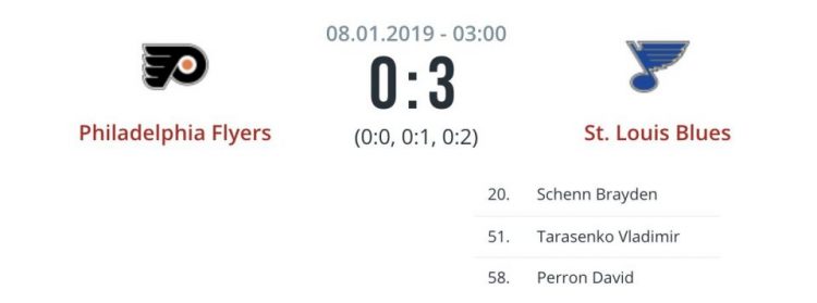 После 5 безголевых матчей наконец-то Владимир Тарасенко забросил шайбу. Вообще первая тройка нападения «Блюз» Тарасенко — Шенн — Шварц смотрелась здорово. Именно они забросили 2 шайбы.