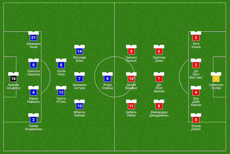 Франция играла этот поединок по схеме 4-2-3-1. На острие атаки действовал Жиру, под ним из глубины играл Гризманн, а на краях атаки разгоняли Матюиди и Мбаппе. В опорной же зоне действовали Канте и Погба, а в защите по краям Лукас и Павар, а в центре — Умтити и Варан.
