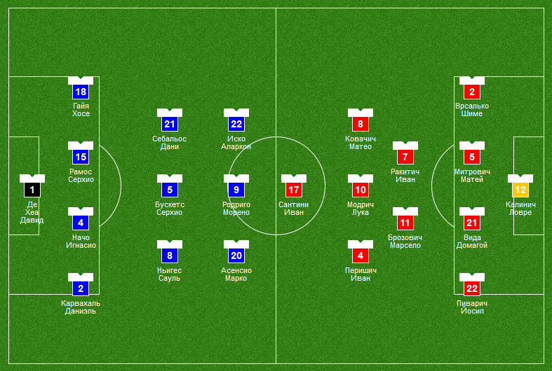 Что касается хорватов, то они играли по 4-2-3-1. Единственный форвард — Сантини, под ним играл Модрич, на краях Ковачич и Перишич, а в опорной зоне — Ракитич и Брозович. В обороне на фланга действовали Врсалько и Пиварич, а в центре — Митрович и Вида.