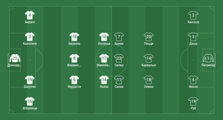 Италия уверенно контролировала матч, но в атаке не хватало неординарных действий, чтобы вскрыть оборону португальцев. Пока на 35 минуте не случился голевой момент у хозяев. Верратти выдал великолепную разрезающую передачу, которую запорол Иммобиле.
