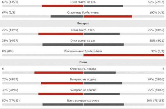 Процент первой подачи был значительно выше у россиянина, он показал 69, у Вавринки этот показатель остановился на 57. При этом и процент выигранных очков у Карена был выше, причем, что на первой, что на второй подачах. По сути, если сопоставить все эти показатели, ну никак такой результат не вырисовывается на табло.