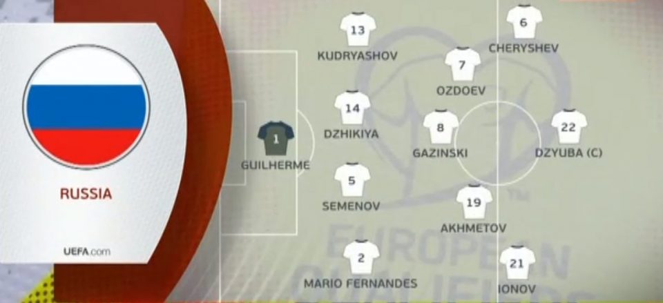 Главный тренер гостей кардинально изменил состав с прошлым матчем против сборной Бельгии. Вышли 4 новых игрока! Теперь расстановка 4-5-1 при оборонительной тактике и 4-3-3 в атаке. Станислав Саламович не выпустил Жиркова, аргументируя его не боевой готовности на игру. Слева в защите занял место Кудряшов. В центре Семенов составим компанию Джикии. Главная проблема — потеря в центре Головина и Кузяева. Черчесов сделал треугольник в средине поля: Газинский, Ахметов и Оздоев. Боязно было и за правый фланг атаки, который занял Ионов.
